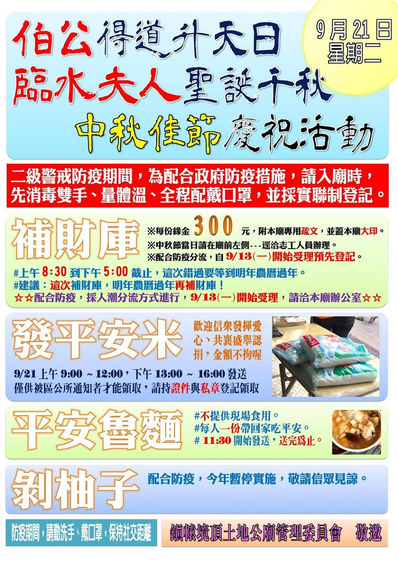 辛丑年(2021)中秋節慶祝活動,歡迎信眾參與