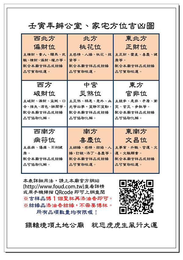 本廟為使信眾所祈求之吉祥品能發揮絕妙之功效,特請專精五行之老師規劃辦公室、家宅方位吉凶圖供信眾參考。使用時只要利用指南針(或手機 APP)定出家宅方位,再觀察方位吉凶圖中顯示橙色為吉祥方位,白色為兇惡方位。