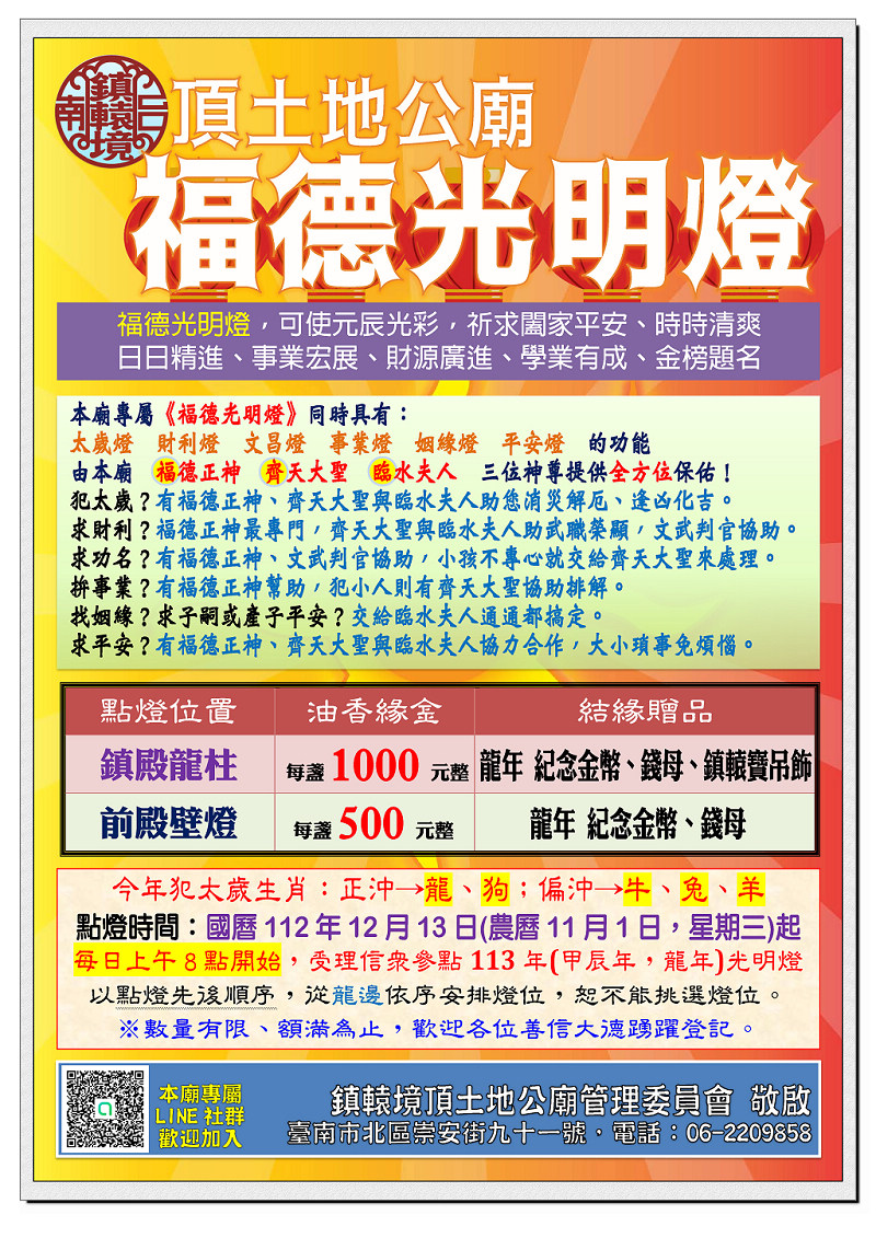 115丙午年 鎮轅境 【福德光明燈】於農曆11/1開始受理現場登記。