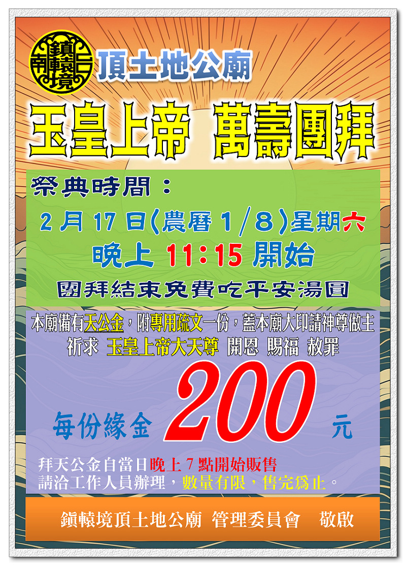 115丙午年 鎮轅境 【福德光明燈】於農曆11/1開始受理現場登記。