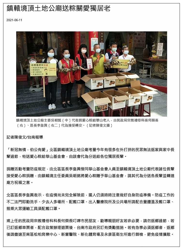 辛丑年(2021)本廟於端午節贈送愛心粽給華山老人新聞報導