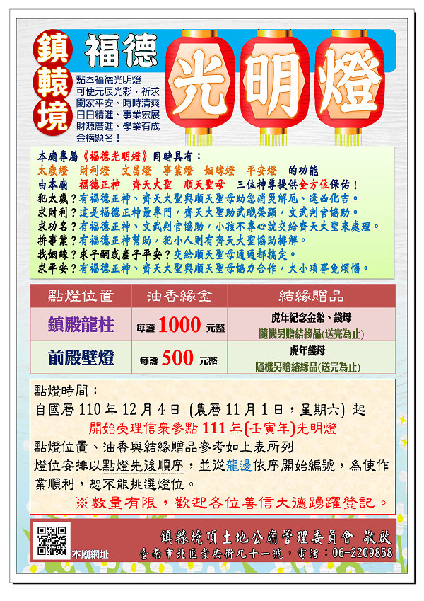 115丙午年 鎮轅境 【福德光明燈】於農曆11/1開始受理現場登記。